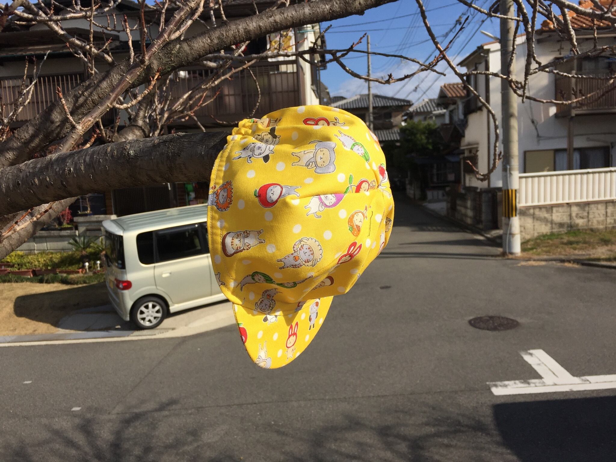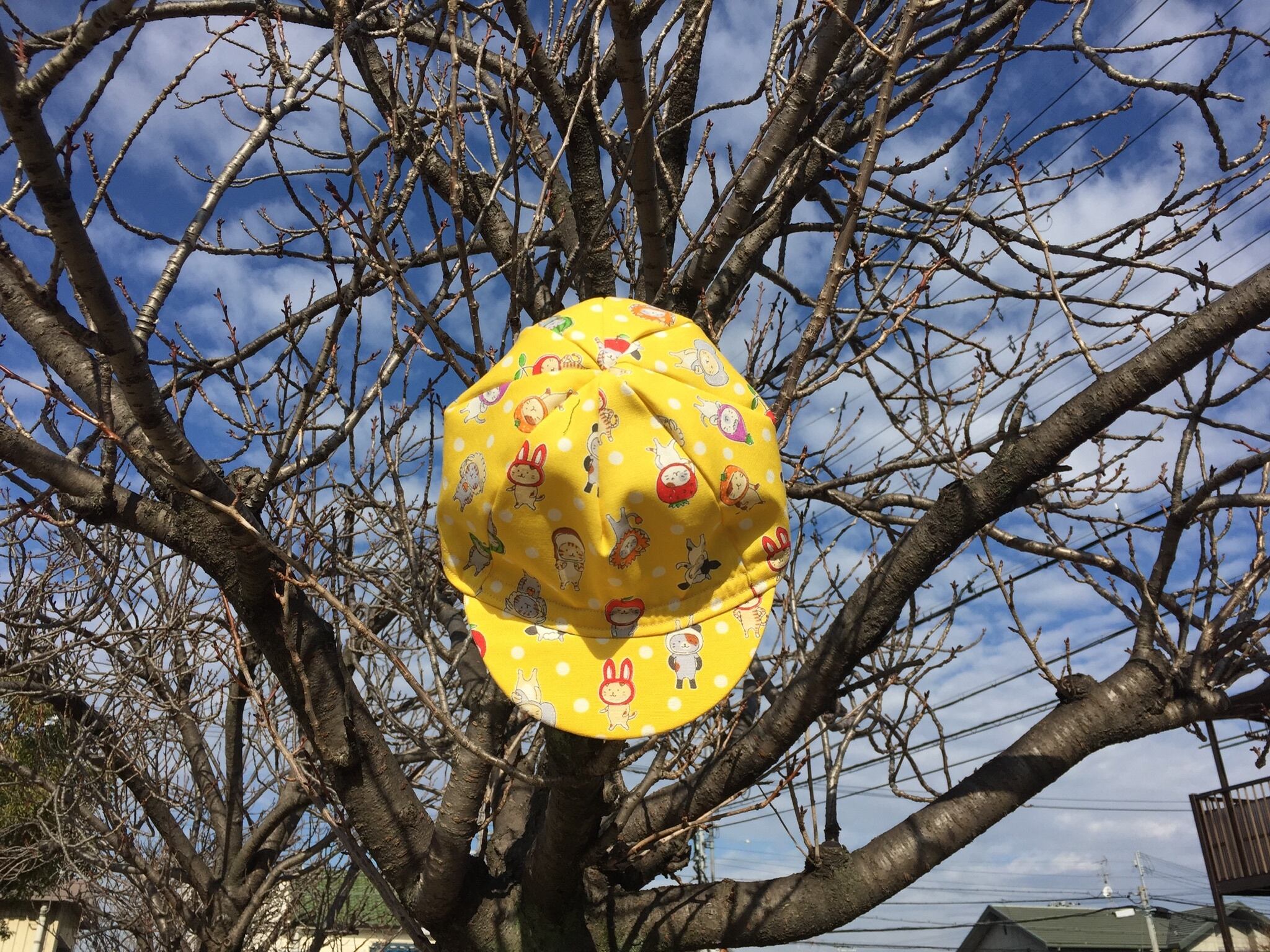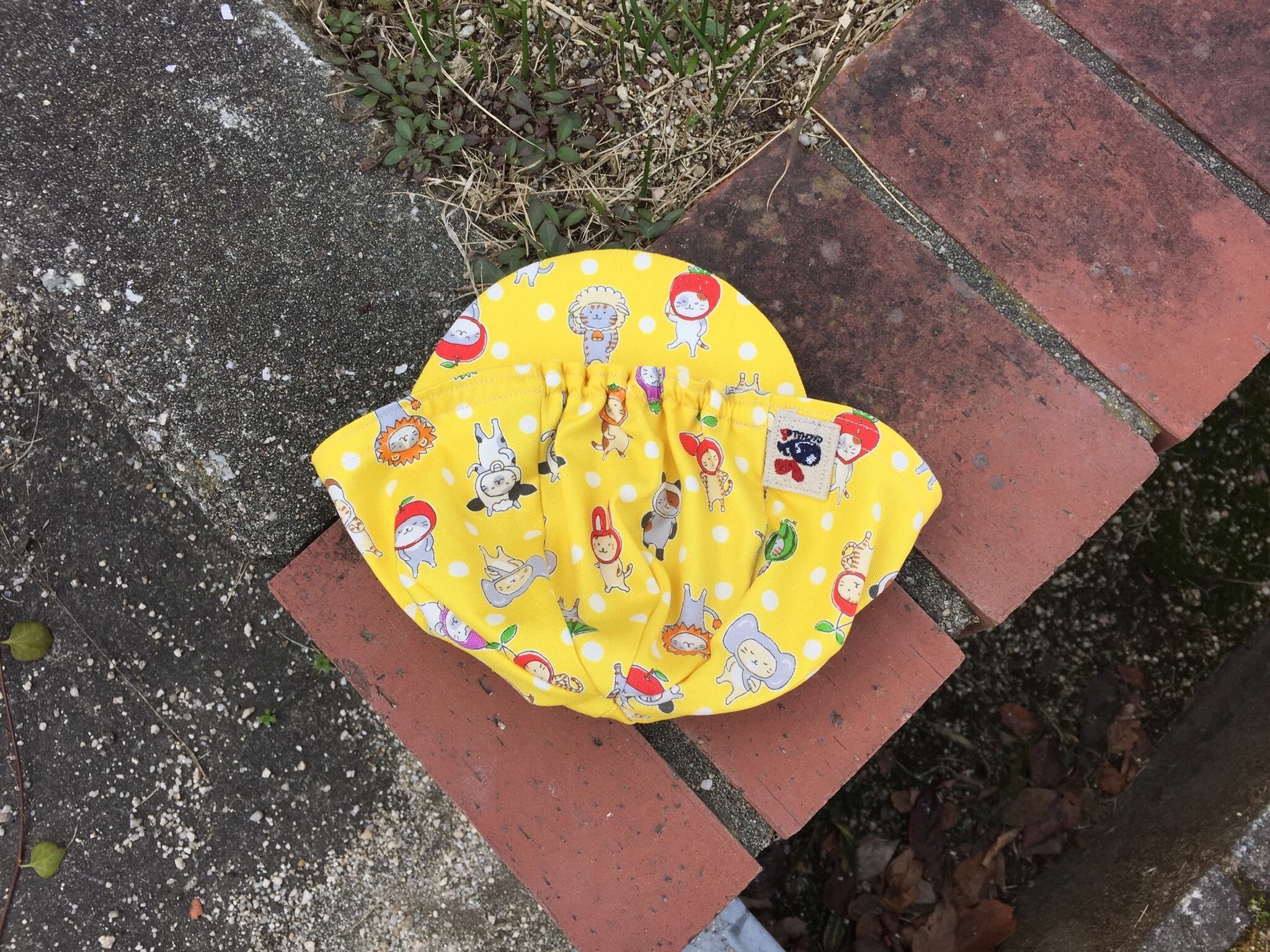 ニャンコが色んな被り物を被っているかわいい生地でcyclecapを作りました。