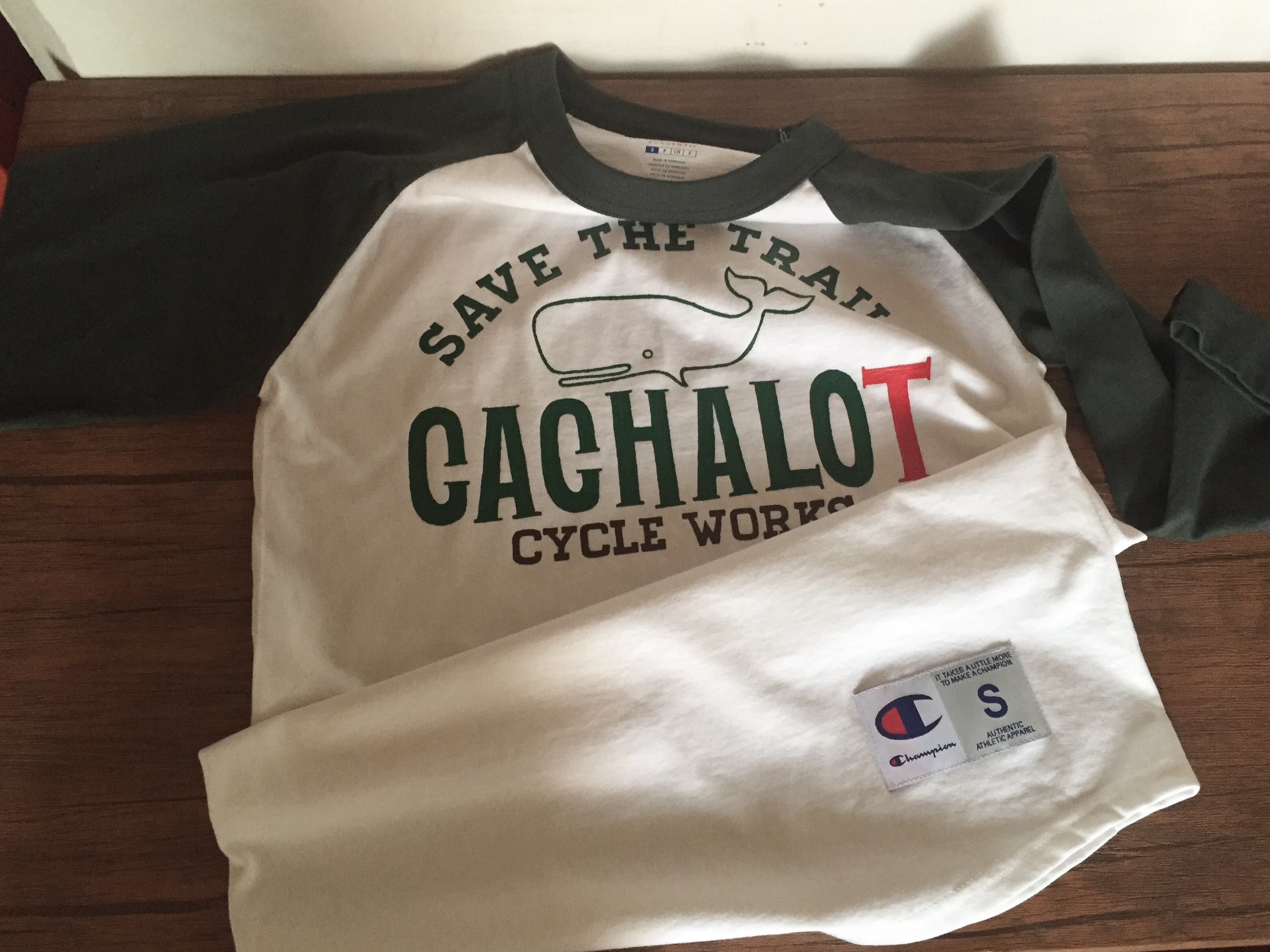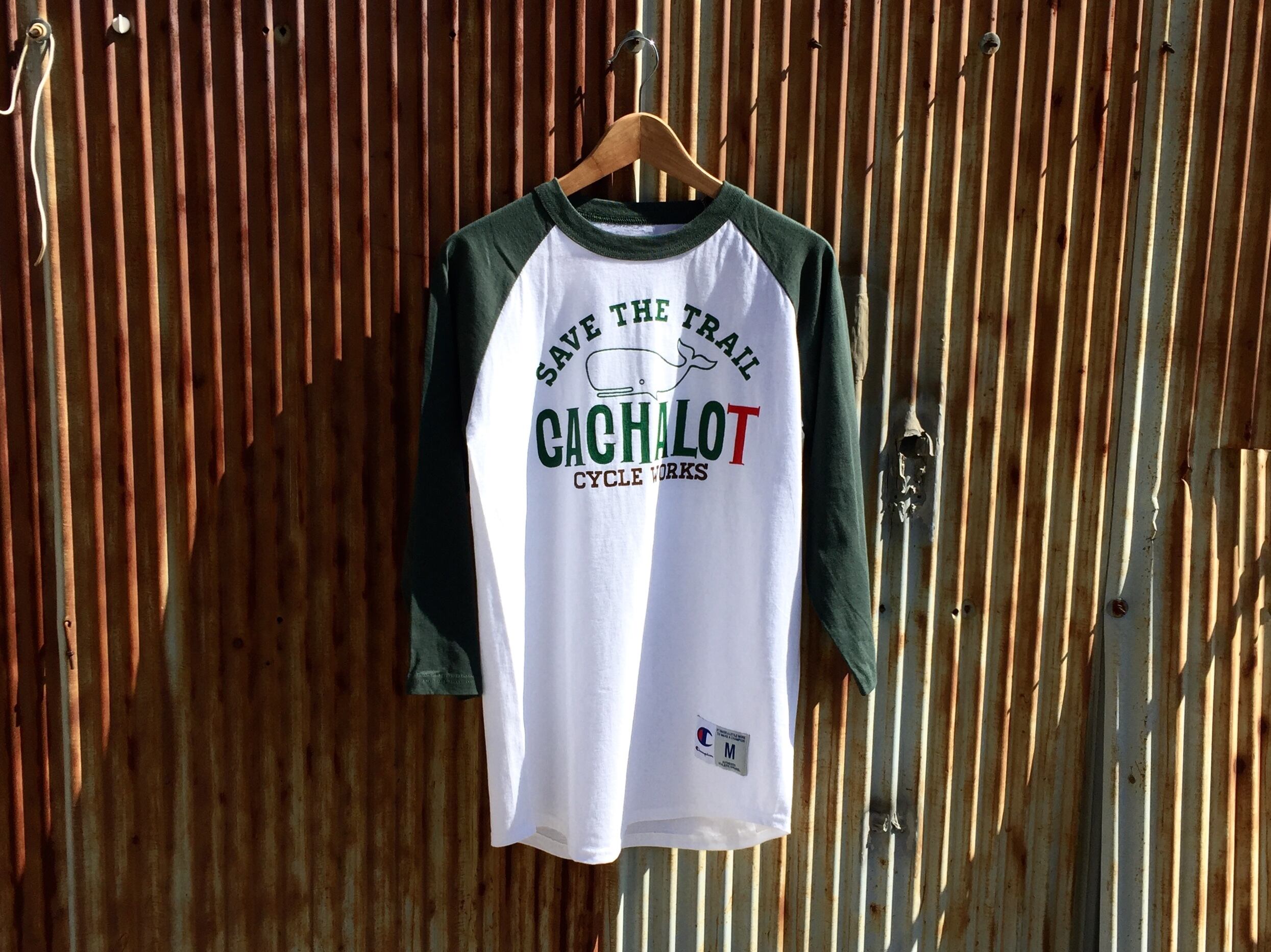 チャンピオンの海外モデル左下の裾部分にサイズとブランドパッチを施したシンプルな5.2オンスのコットン ラグラン7分袖Tシャツに手描きで